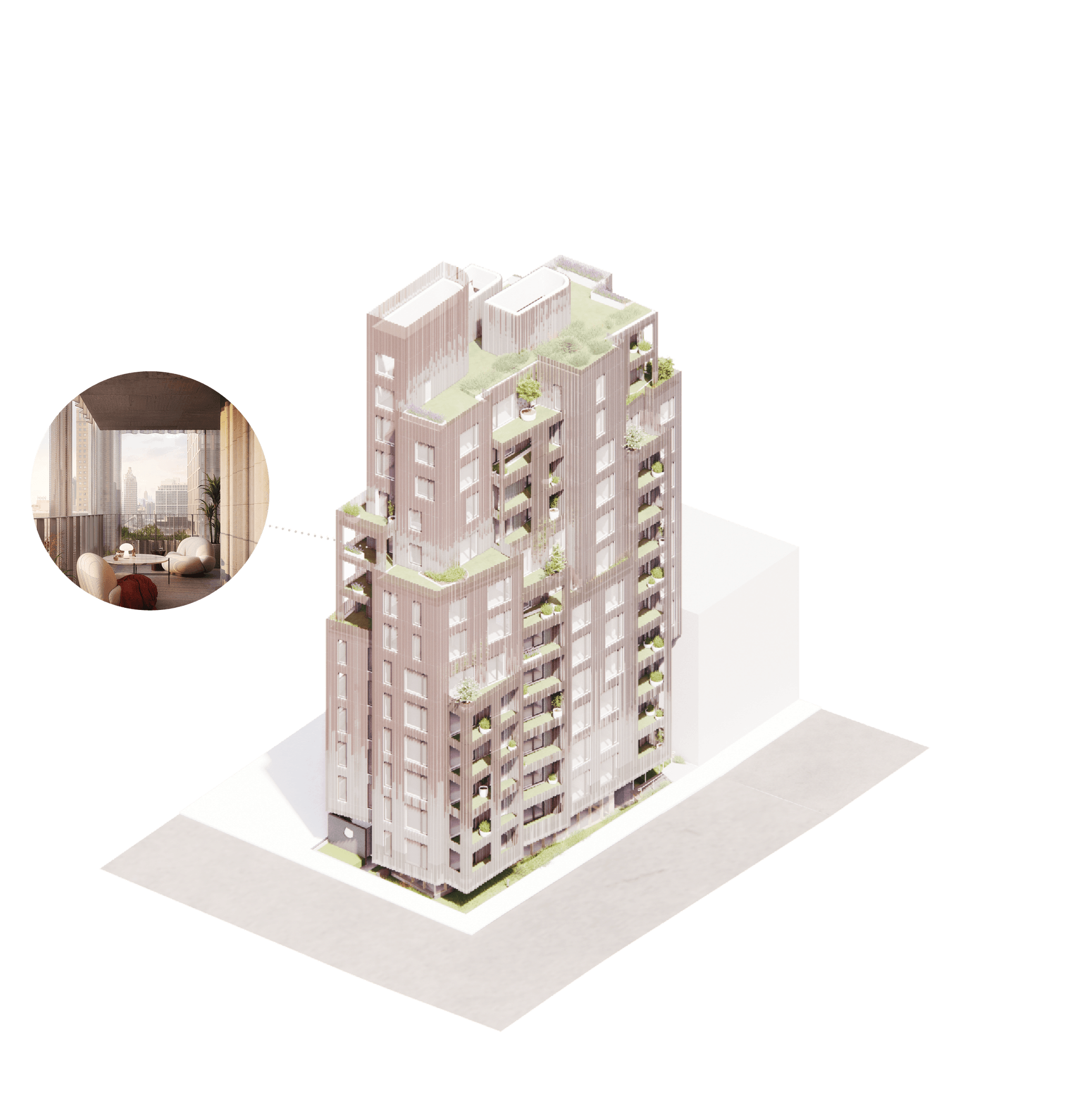 SO—IL’s extensive experience designing dynamic spaces for the public realm has informed a unique condition between the street and the lobby, where a blurred perimeter acts as a community gathering space for residents, akin to the traditional New York City stoop. Descending into a landscaped garden, this unique condition continues along the journey from the lobby to the individual residences, a carefully considered arrival through a series of covered, landscaped breezeways offering a pleasant experience with access to both light and air.