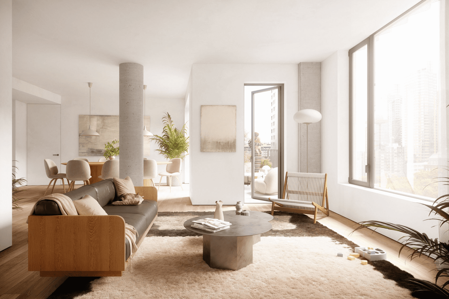 - White walls are paired exposed concrete columns and details, and white oak floors define a minimal, high design aesthetic.