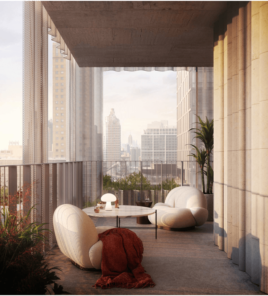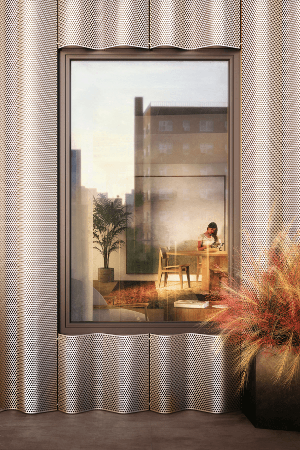 - The vast majority of outdoor spaces are covered loggias, which are afforded additional privacy and weather protection by the screening of the undulating metal façade and are usable rooms year-round.
